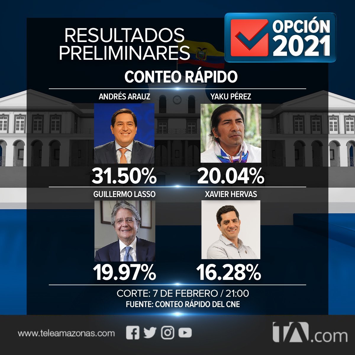 2.000 actas son de Guayas, donde Arauz tiene un 42%, Lasso un 25% y Yaku un 8%.