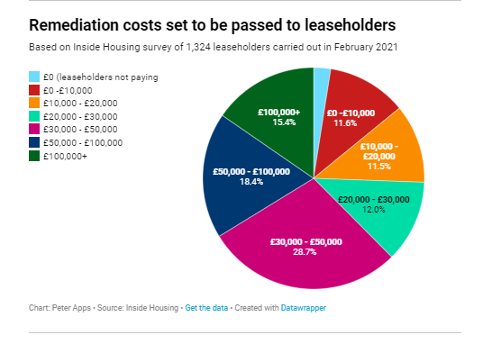 - While almost 90% are being asked to remove dangerous cladding, problems extend much further (v significant for announcement later). 68.3% require repairs to defective fire breaks; 59.3% require the removal of balconies; 53.6% require repairs to internal compartmentation