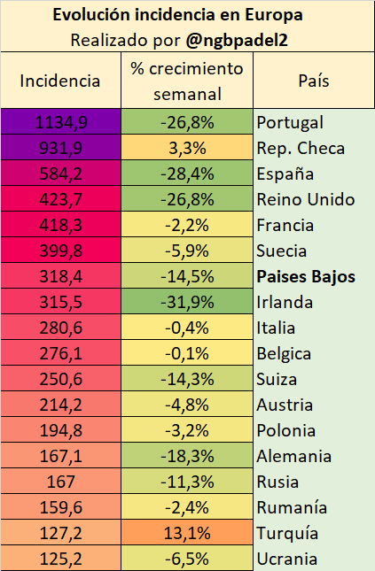 ➡️Incidencia Acumulada en 14 días en diferentes países de Europa y resto del mundo: