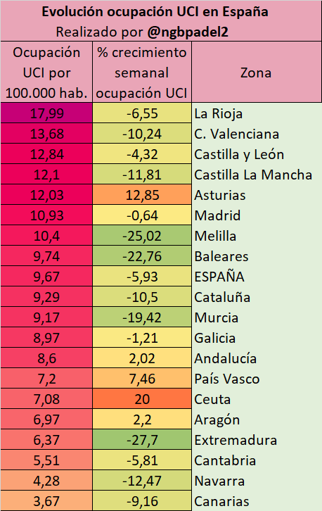 * Personalmente veo un error que Sanidad publique el % de ocupación por covid sin indicar el % de ocupación total (incluyendo todas patologías). La ocupación media anual antes del covid era 60%-70% (a sumar al Covid)