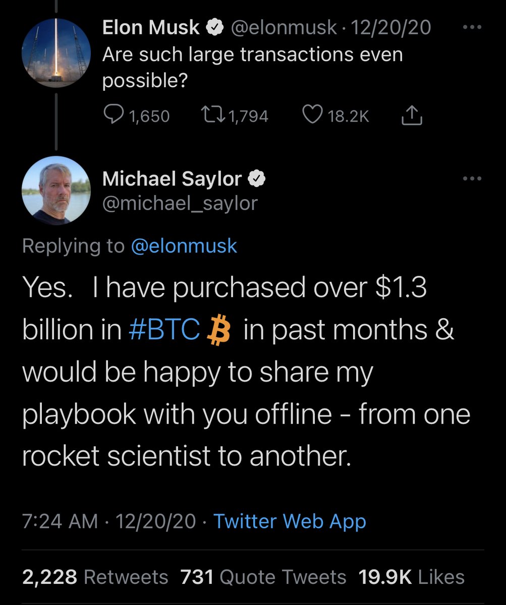 14/ But now that MicroStrategy has shared their “playbook” of how to do this, it has shortened the adoption timeline even further. At the end of December, Saylor and Musk connected (if it wasn’t just for show).