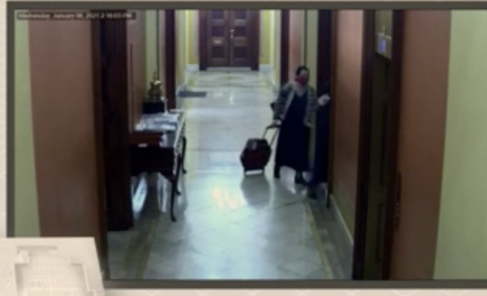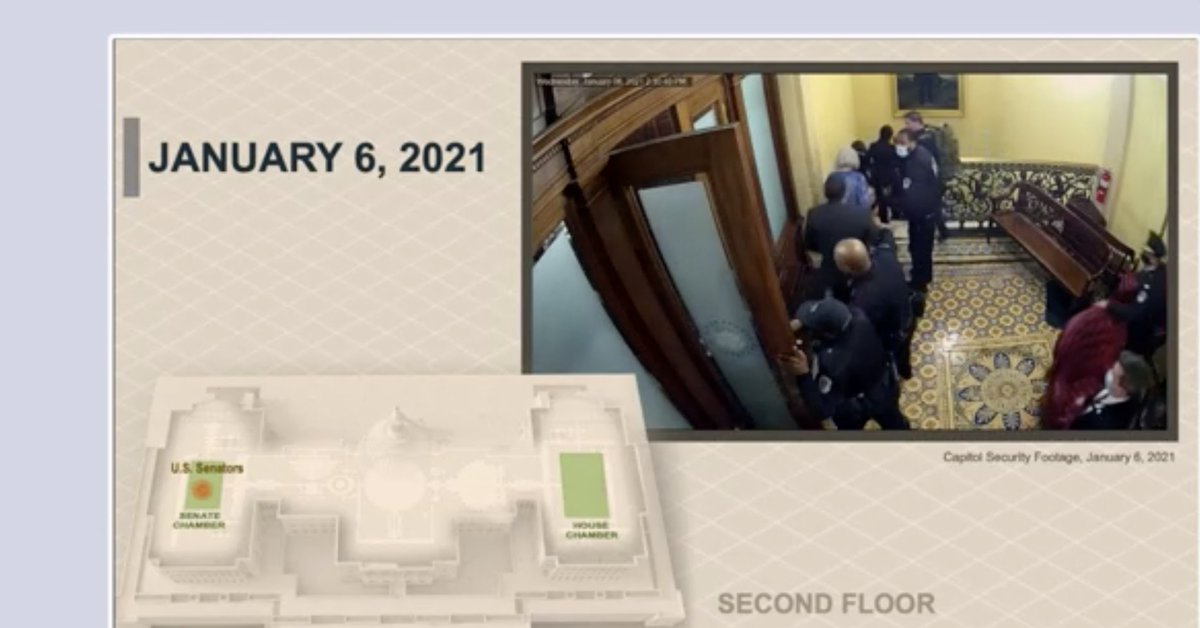 Plaskett plays video and audio of a mob banging at the door where some of Speaker Pelosi's staff were barricaded during the riot.