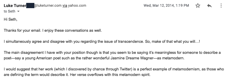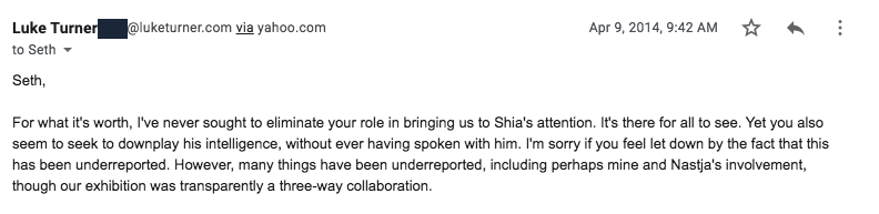 I told Lyz Lenz if she contacted Luke Turner, he'd lie about his scores of contacts with me. She called him, he said he'd never had any contact with me. So why didn't she ask me to produce the emails I have from him? Here's one of the scores (just the start—his emails were long):