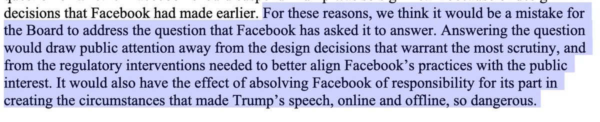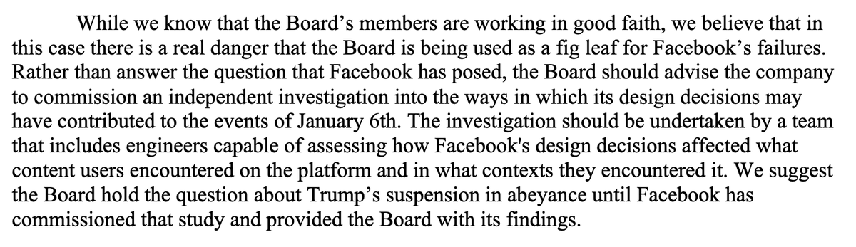 Rather than answer the question now, we say, the FOB should insist that Facebook commission an independent study into how its design decisions may have helped create the circumstances that made Trump’s statements on Jan. 6, online and offline, so dangerous. 6/X
