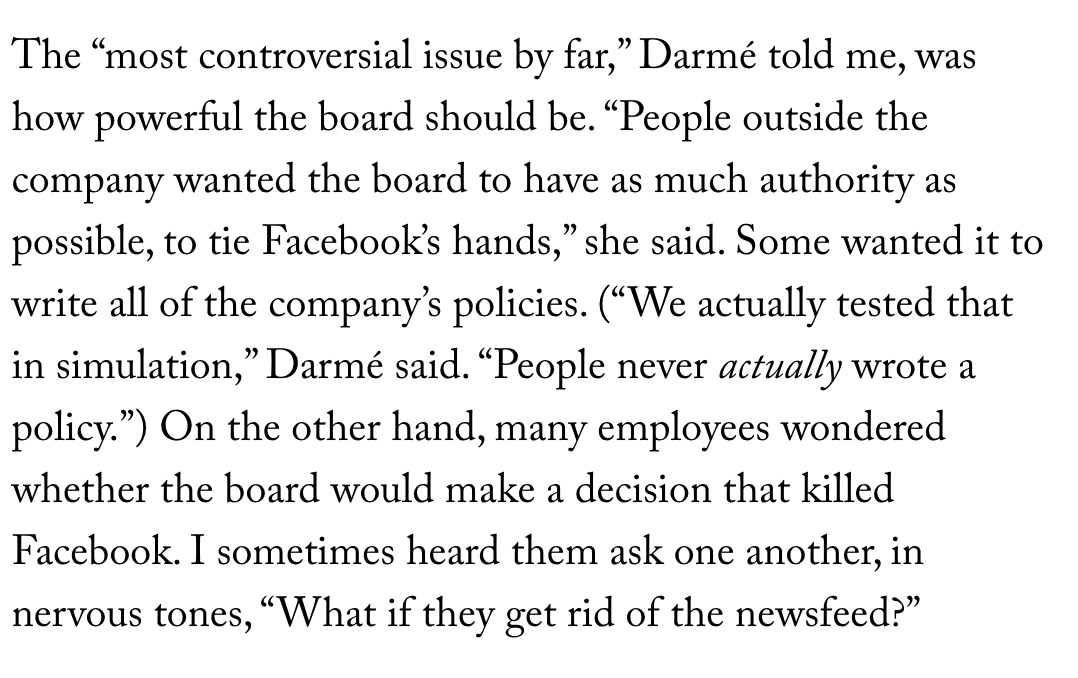 Why didn’t we just argue that the FOB’s mandate be expanded to encompass design decisions? Because it seems unlikely to us that Facebook will ever give the FOB authority over decisions that are so central to its business model. 7/X