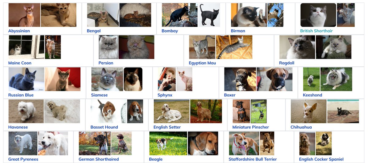 It consists of 37 classes, with very few examples (around 200) per class. These breeds are hard to tell apart for machines and humans alike!