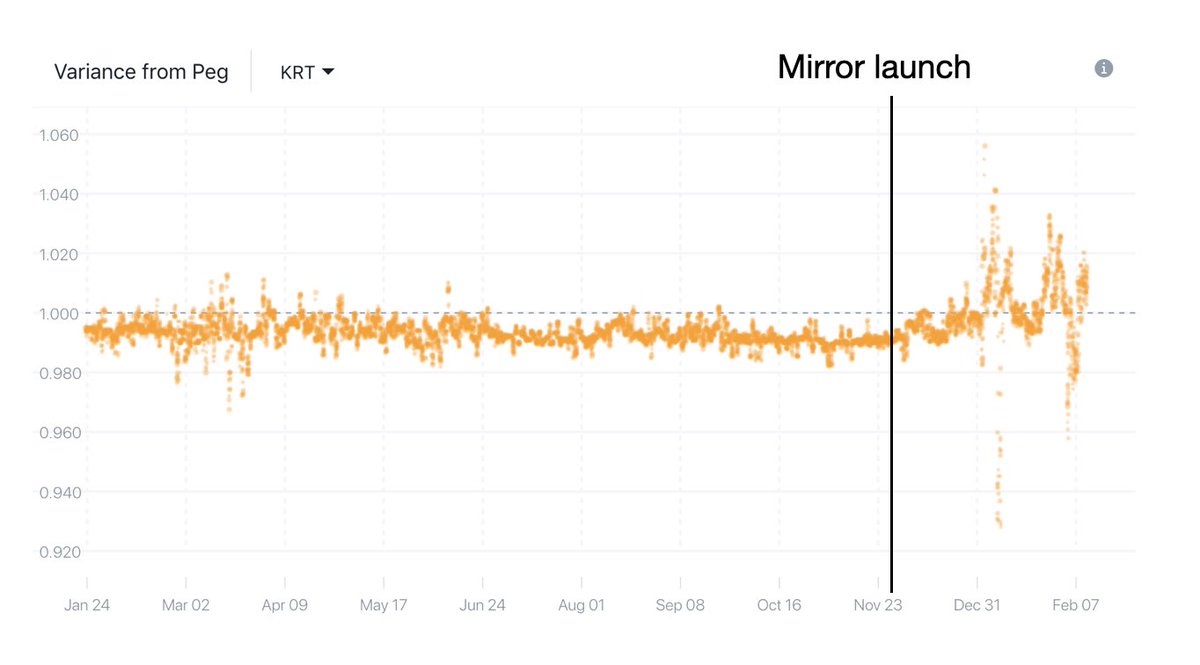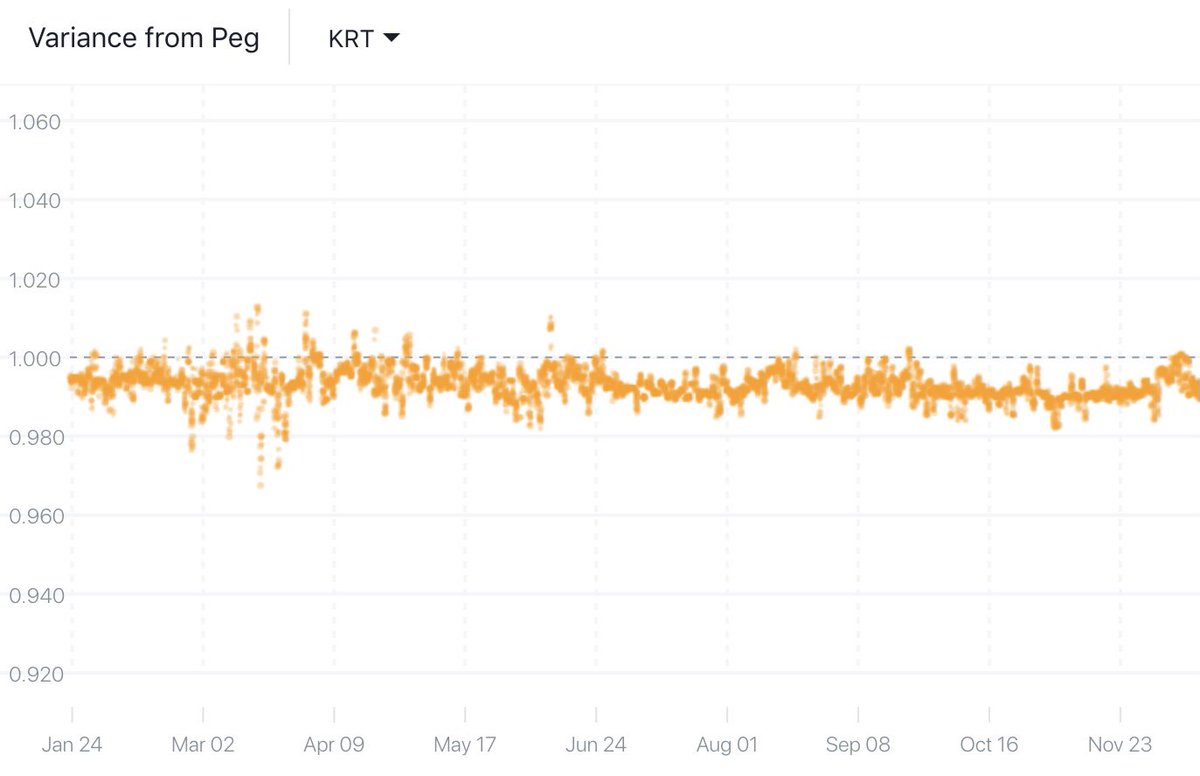 Say you are a merchant in the ecosystem and you receive synthetic KRW (KRT) as payment because lower fees and it’s convenient. If KRT is interchangeable with KRW, a rational agent would opt for always swapping into legal tender post payment, because KRW bears less risk than KRT.