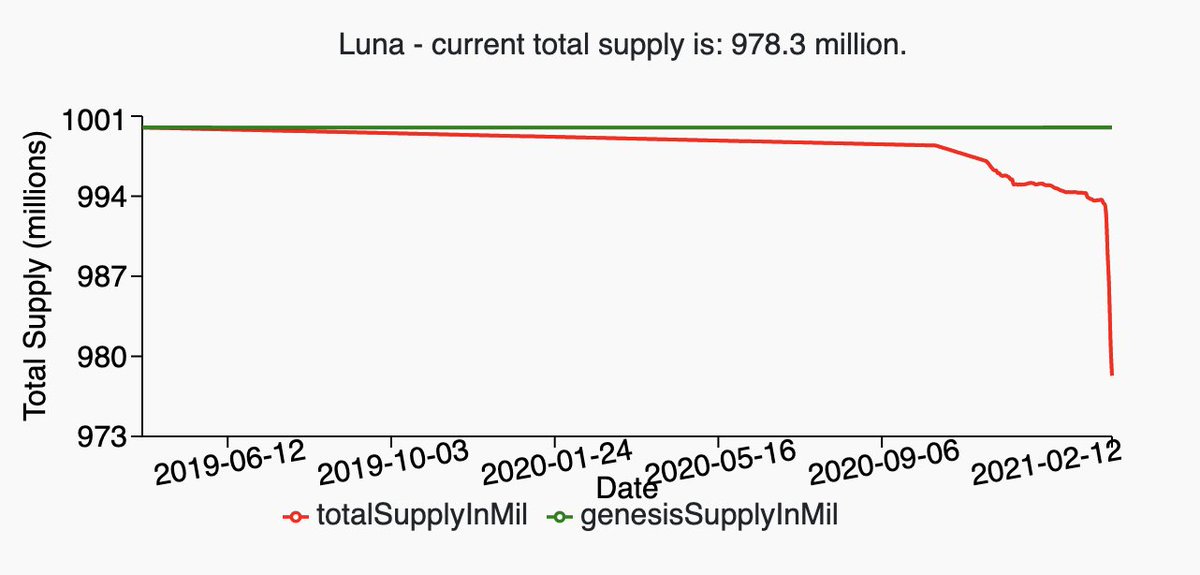 UST is in such demand that now the opposite is happening—the pair is consistently trading above the peg (as is KRT) and to temper this, LUNA must burned in order to mint more UST. That makes LUNA ever scarcer over time, as demand for UST and other stables increases.