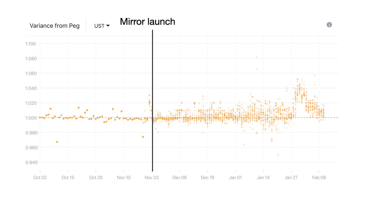 Enter @mirrorfinance and subsequently @alice_finance and @anchor_protocol—now the ecosystem has gone from a state of no clear incentive to hold the stables, to up to 400%+ APY on UST.