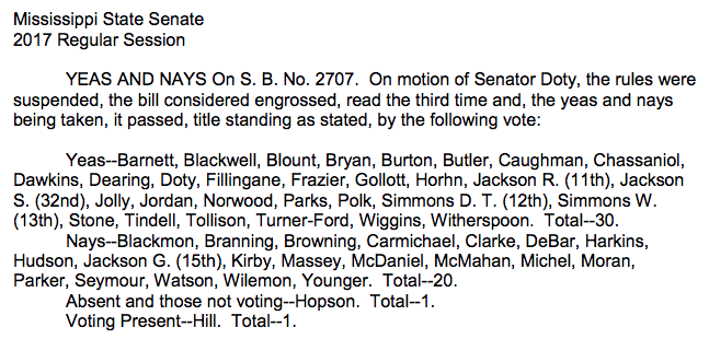 The Senate passed Doty's bill by a vote of 30-20, with Sen. Hill courageously voting present. Notably, Sens. Debar, McDaniel, and Watson all opposed the bill.