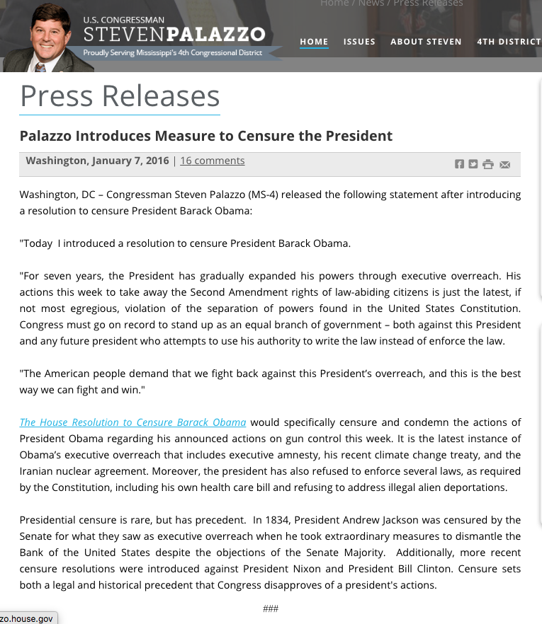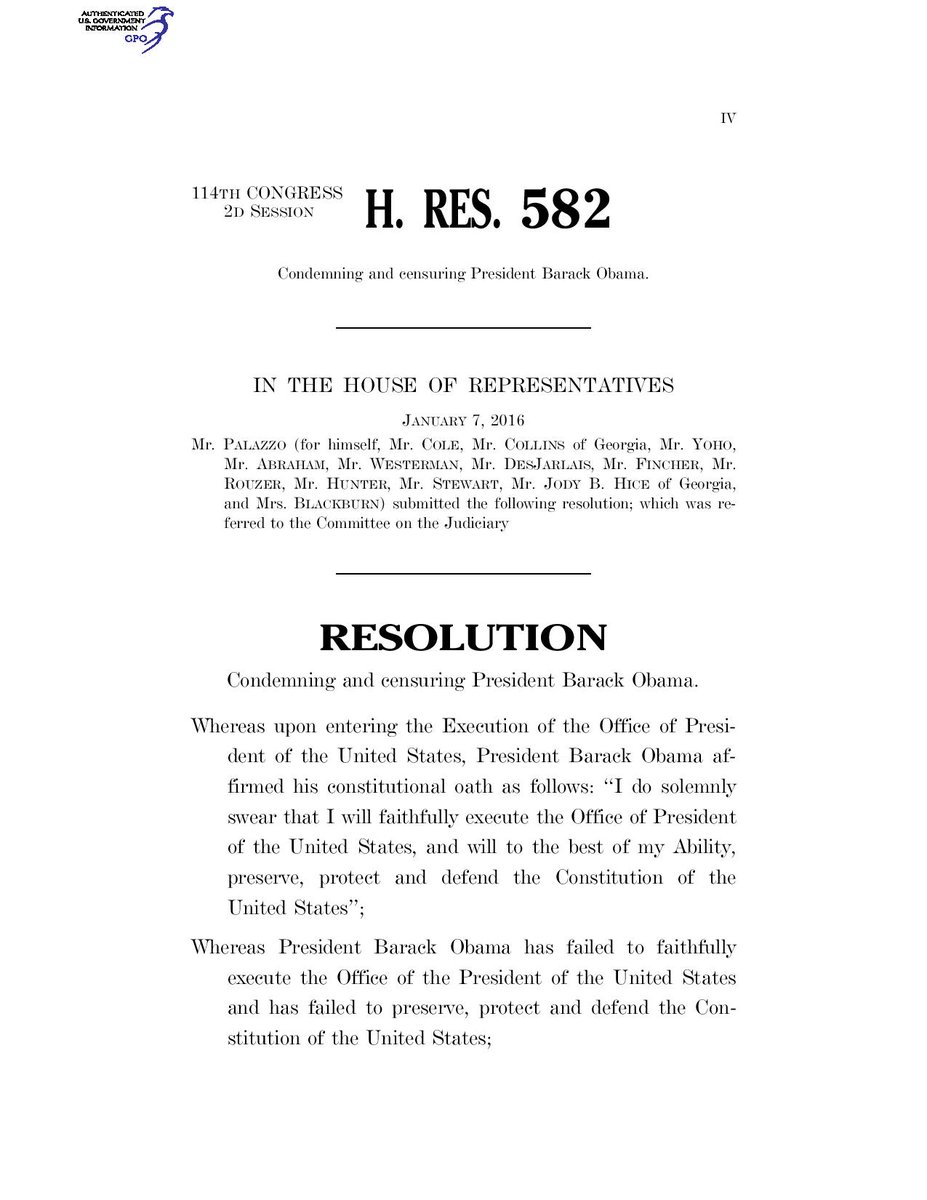 Palazzo is the original sponsor of a resolution to condemn and censure President Obama, which Palazzo introduced in the US House in 2016 congress.gov/bill/114th-con…