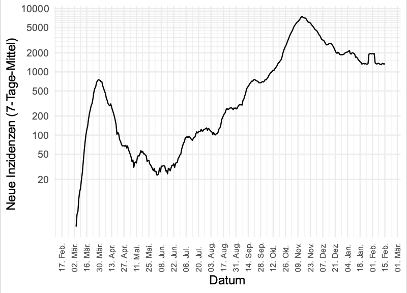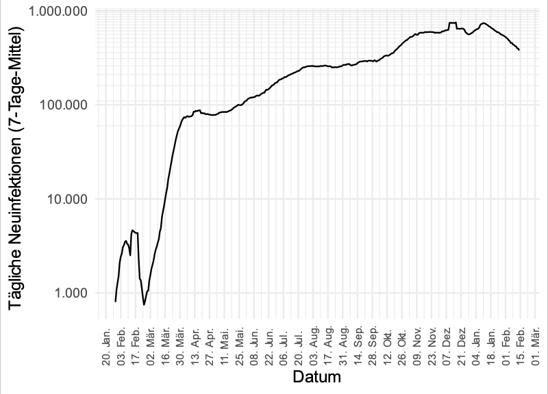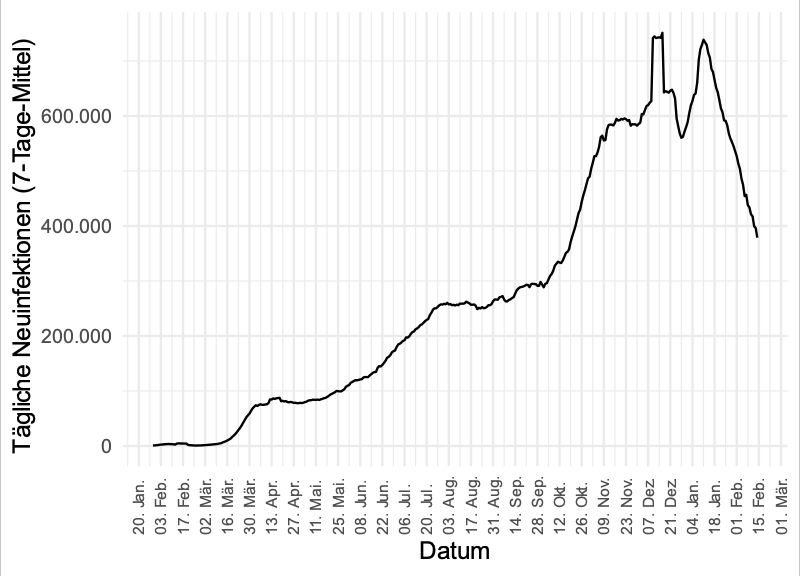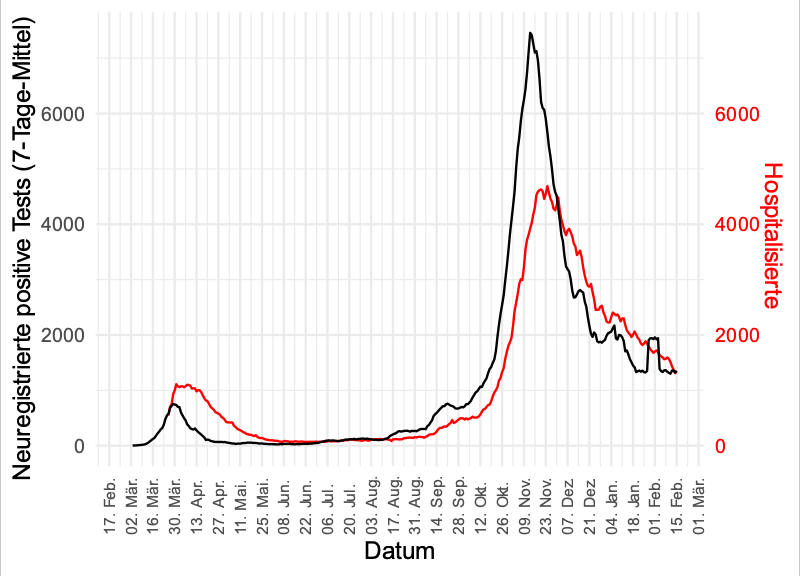 Zwischen 26. und 28. Jänner wurde die Zählung der laborbestätigten Fälle umgestellt. Vom 27. zum 28. Jänner sind 5248 Fälle dazugekommen, in den 2 Wochen davor lagen die Werte zwischen 800 und 2000.
