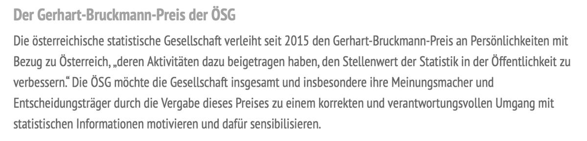 Falls nach meinen Ergüssen nioch irgendjemand Interesse daran hat, was Statistik im öffentlichen Leben bewirken kann:Ich 2017 der Gerhart-Bruckmann-Preis der Öst. Statistischen Gesellschaft verliehen bekommen. Als Teil der Verleihung durfte ich auch über einige