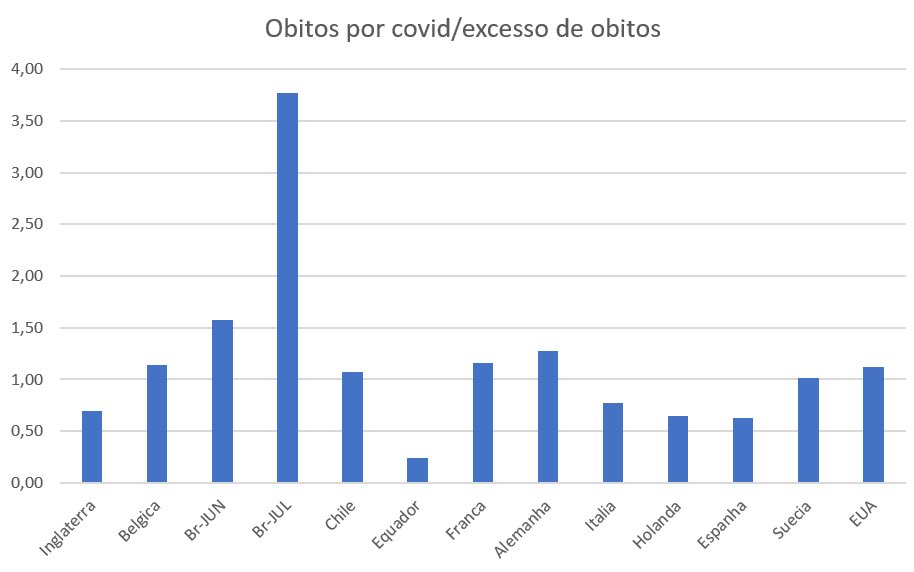 Vamos aproveitar o gráfico para ver que em outros países fica de 0,5 a 1,2 a relação COVID-19, excessos. Será que é diferente mesmo no Brasil?