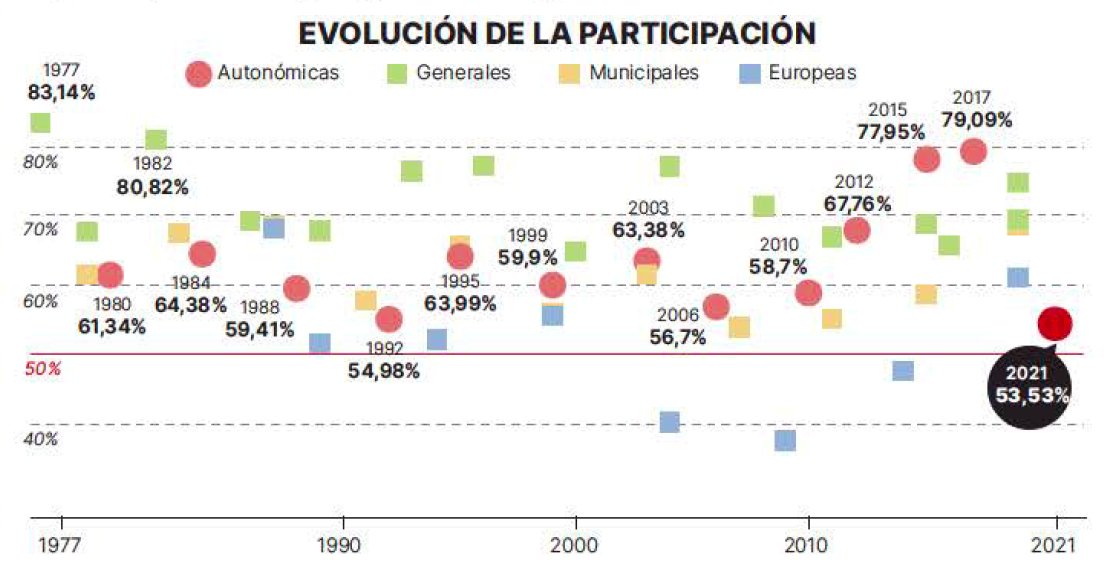 3) Evolución del porcentaje de participación en los diversos procesos electorales (vía @elperiodico )