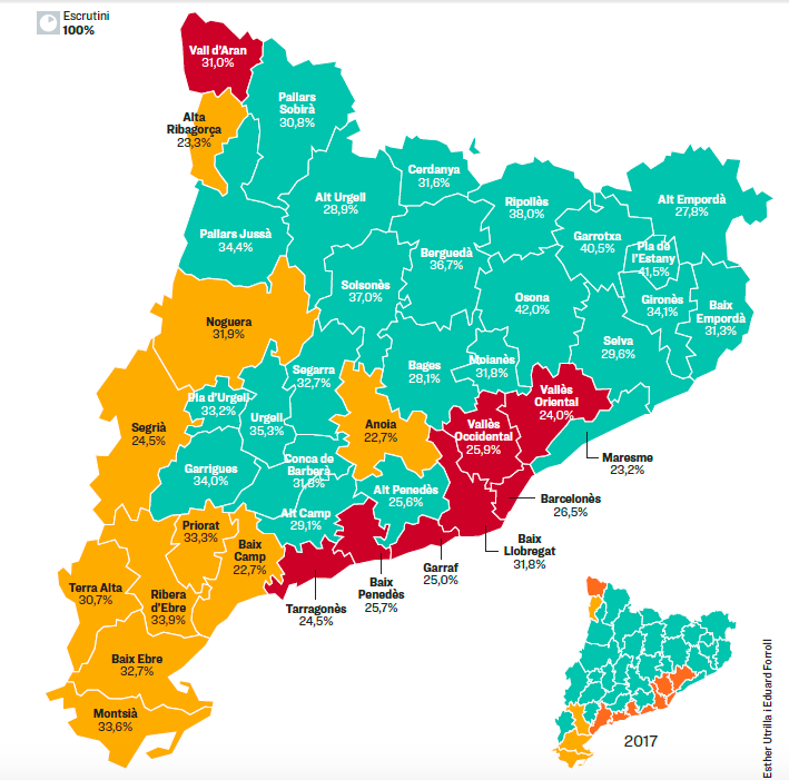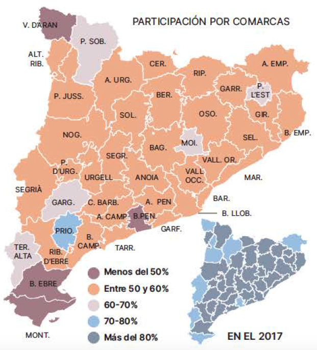 4) Participación por comarcas en las elecciones regionales catalanas de 2021 (vía @elperiodico )
