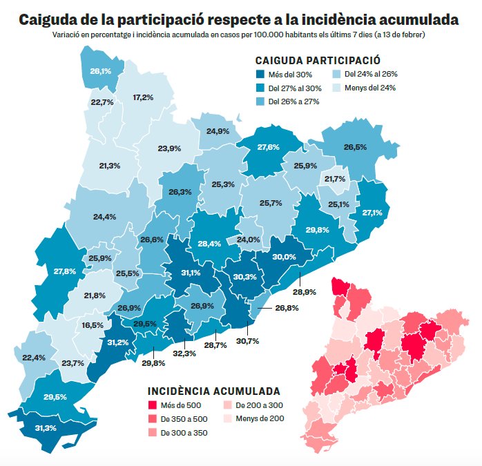 7) Mapas de contraste entre disminución de la participación por comarcas e incidencia acumulada del coronavirus (como se puede ver NO hay correlación exacta) (via @diariARA )