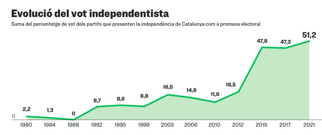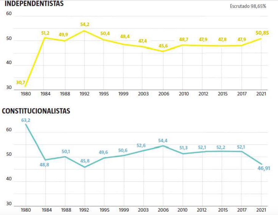 8bis) Evolución del voto entre partidos separatistas ("independentistas" dice el periódico) y unionistas ("constitucionalistas" dice) (vía @larazon_es )