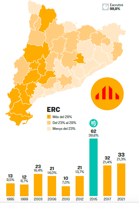 10) Evolución y distribución territorial del voto a ERC (segundo partido en número de votos y partido separatista más votado) (via @diariARA): su mayor fuerza está en el interior de Tarragona y en Lérida. Bastante menos en Barcelona y Gerona.