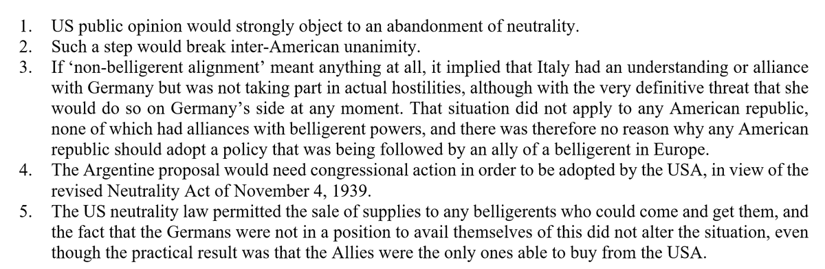 to the effect that ARG & USA -&possibly other American republics – abandon neutrality to side with the Allies without actually becoming belligerents, much in the same way as Italy sided with Germany but did not yet participate in the war. The US reply consisted of five points: