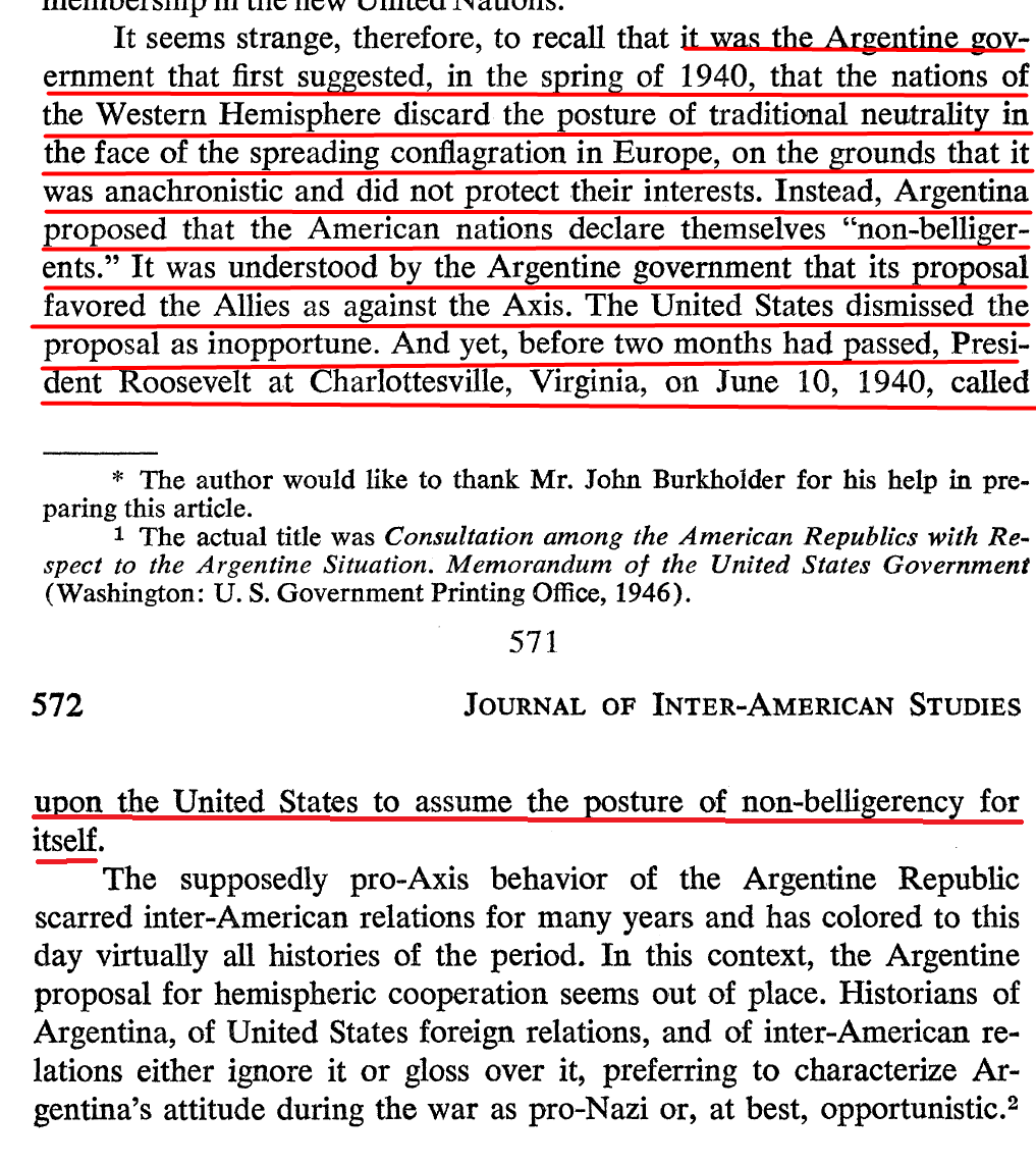 In 12/1939, partly as a consequence of the Battle of the River Plate, the Argentine govt concluded that neutral rights were a fiction, and that the dev't of the war would not allow true neutrality. Thus, Argentine Foreign Minister José María Cantilo suggested to...