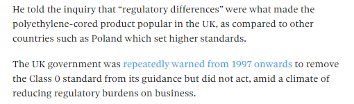 - Says 'regulatory differences' reason why highly combustible panels were so popular in UK