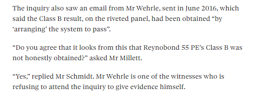 The most interesting point of this morning's evidence came right at the end of the session when Claude Schmidt was grilled about an email his colleague Claude Wehrle sent regarding the serious failure of polyethylene-cored ACM panels when bent into a cassette form in March 2010
