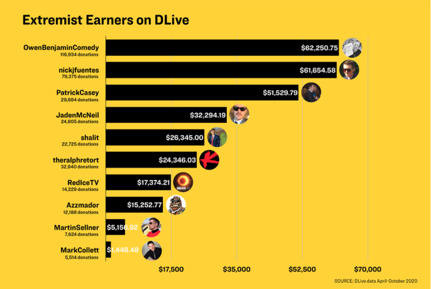 one of the top earners, white nationalist Nick Fuentes (who participated in the 2017 "Unite the Right" rally), recently said on his stream that he wanted "Roman salute" Trump. the gesture is also known as a Hitler salute.