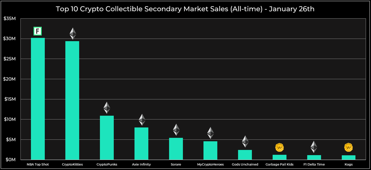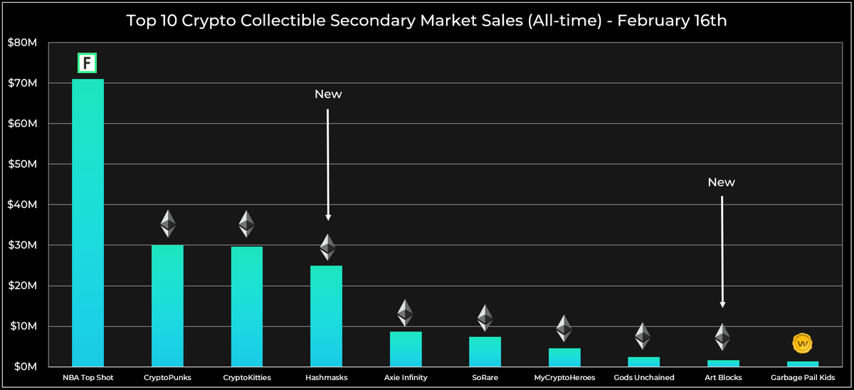 16/ Note the enormous increases in all-time secondary market volumes for some of these projects in less than a month (2.3x for @nba_topshot, 2.7x for @thecryptopunks), as well as the entrance of @TheHashmasks and @artblocks_io to the podium spots.