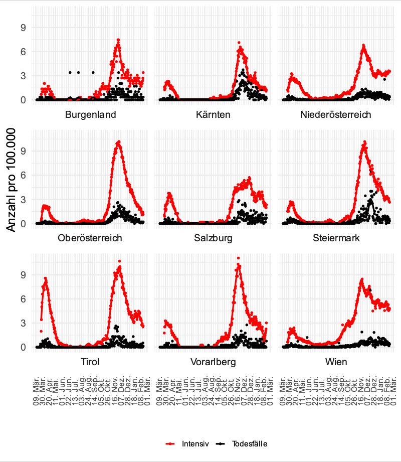 Intensivfälle und Verstorbene - Bundesländer (täglich)