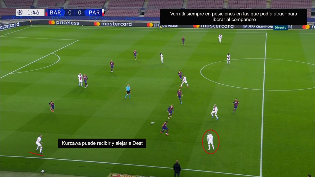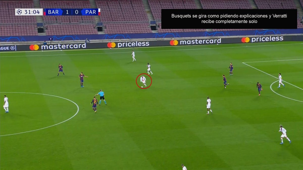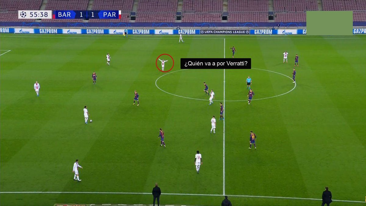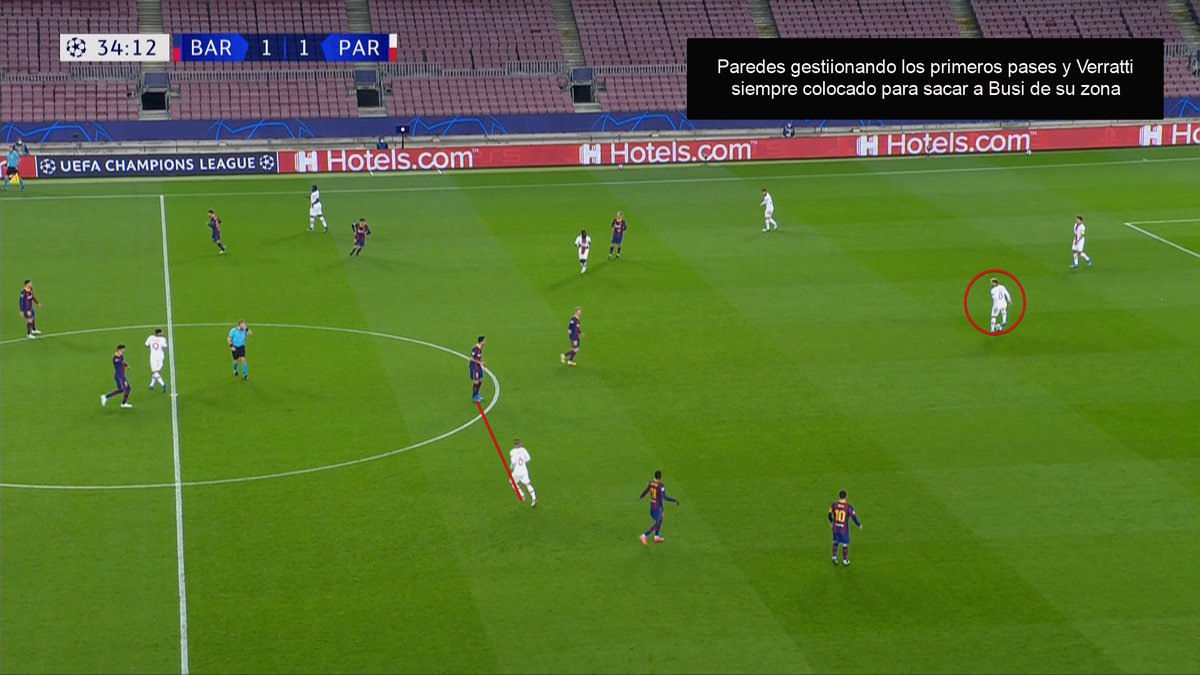 Me sorprendió mcuhísimo que el FCB no tratase de encimar a Paredes, que sufre jugando acosado y disfruta jugando de cara. Y de nuevo fijaros en Verratti cómo se aleja del balón para abrir una línea de pase y arrastrar a Busi.