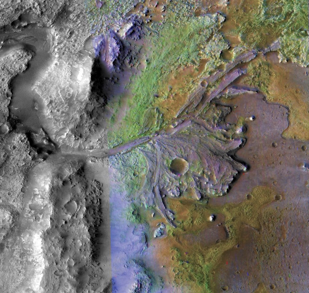 14) Jezero Krateri’nin 3,5 milyar yıl önce bir göl olduğunu biliyoruz. Buna eminiz, fotoya bakın siz de emin olursunuz. Kocaman iki tane nehirden sular şırıl şırıl akmış yıllar önce. 💦