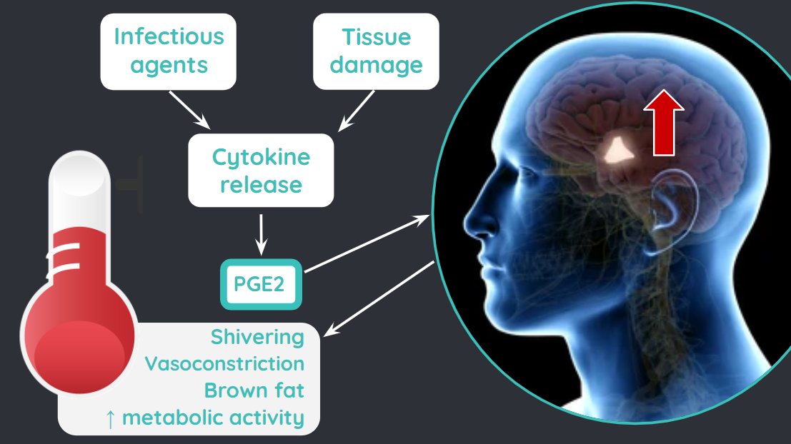 The hypothalamus is the body's thermoregulatory center. Fever occurs when the hypothalamic set point is increased due to high levels of prostaglandin E2 (PGE2). Tylenol and NSAIDs work by inhibiting synthesis of PGE2. (…-nature-com.ezp-prod1.hul.harvard.edu/articles/nri38…)