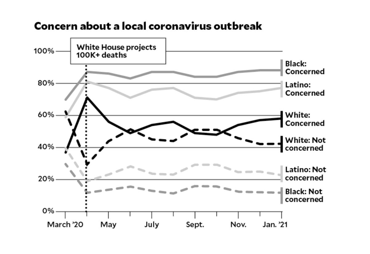 An estimated 88 percent of Black Americans and 77 percent of Latinos are concerned about a COVID outbreak in their local area, but only 58 percent of white Americans say they are concerned about a local outbreak. (8/x)