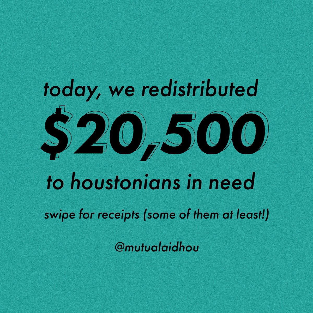 TO YOU, FROM MUTUAL AID HOUSTON: Thank you. Tonight, we were able to distribute over $20,000 directly to Houstonians for immediate needs like food and water due to this freeze. We will be working tirelessly to get this relief out to folks who need it as soon as possible. THREAD: