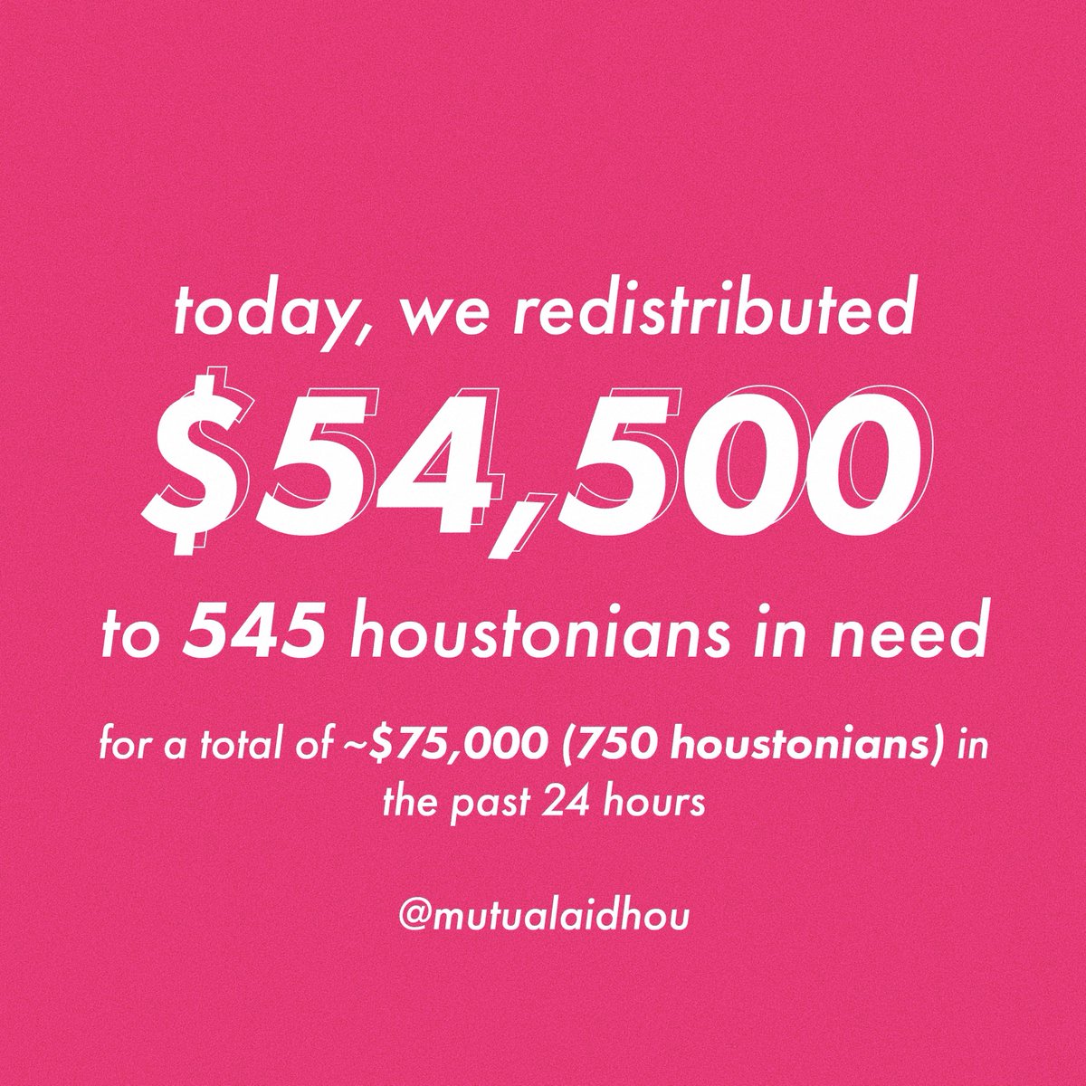 HOUSTON, WE’RE STILL GOING: Today we were able to distribute $54,500 directly to 545 Houstonians in need thanks to YOUR support — for a total of ~$75,000 in the past 24 hours. And we’re nowhere close to stopping: watch this space in the coming weeks for our progress!