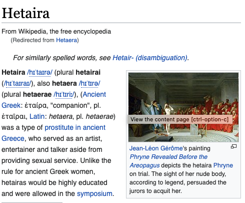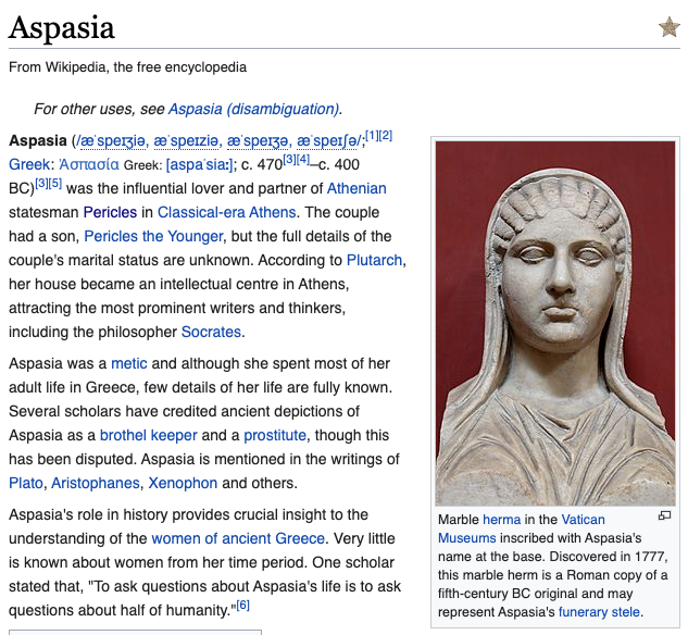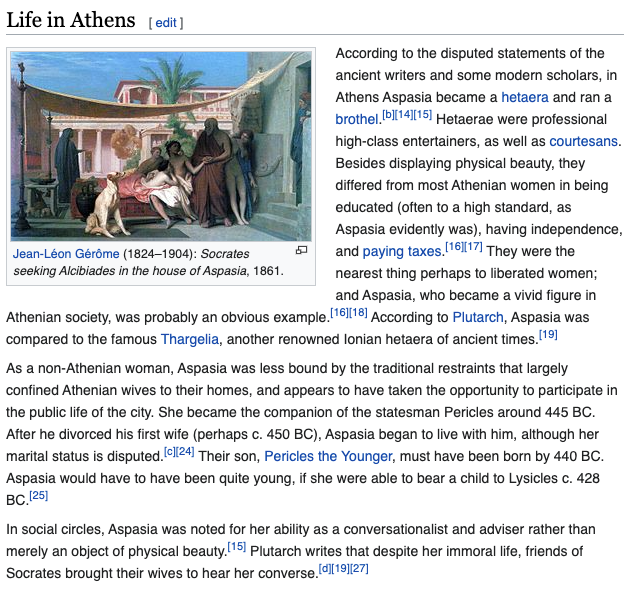 she had been alleged to have been a hetaira, a sort of highly-educated geisha-esque elite courtesan type? complicated, scholars argue about it