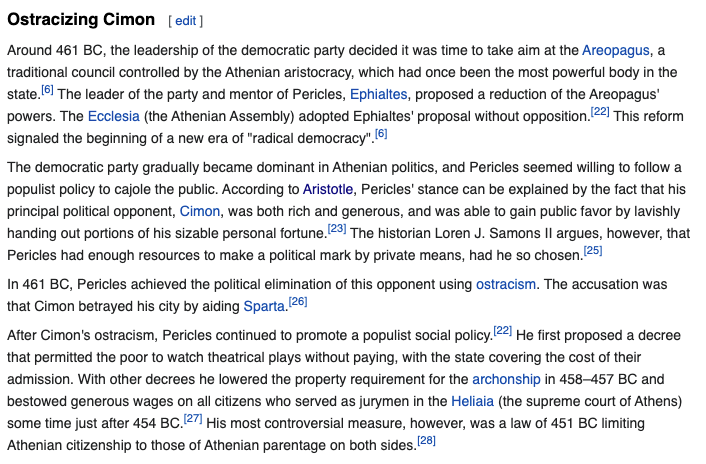 Pericles had his political opponent Cimon ostracized, ie cast out of town – by acusing him of aiding the enemy (Sparta).