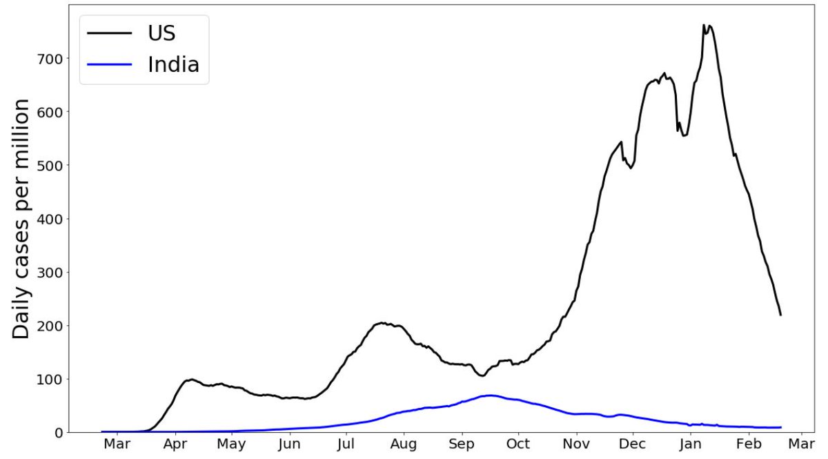 If the US had the same number of new daily cases per capita, they would be reporting only ~3,000 new cases per day.