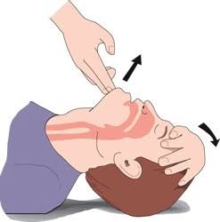 Open the airway. With the child lying back, tilt the head back slightly and lift the chin.