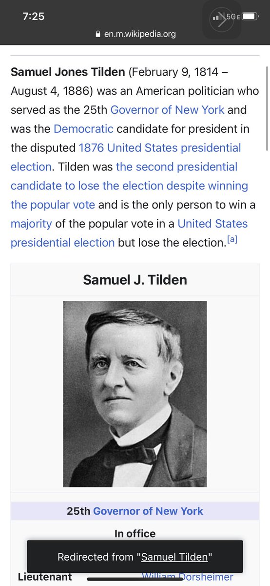 Tilden was the second individual, after Andrew Jackson in 1824, to lose a presidential election despite winning at least a