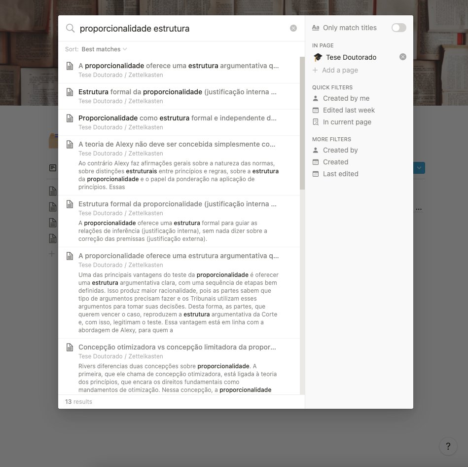 Um elemento essencial de qualquer sistema de notas ou fichamentos é que todas as anotações devem estar disponíveis para busca com base em seu conteúdo. Em outras palavras: elas devem ser pesquisáveis (searchable). É por isso que tomas notas no Word ou no GDocs não funciona.