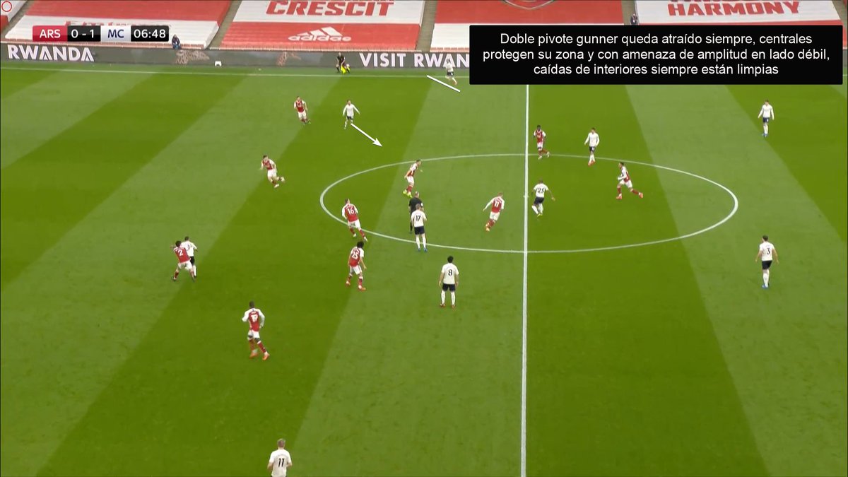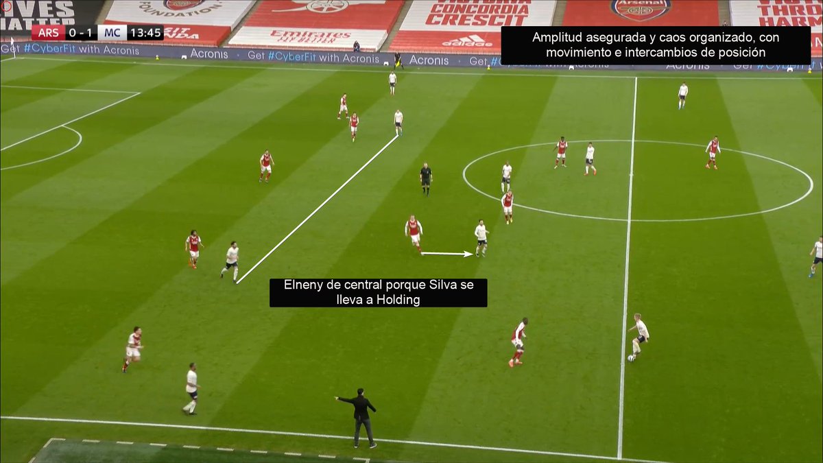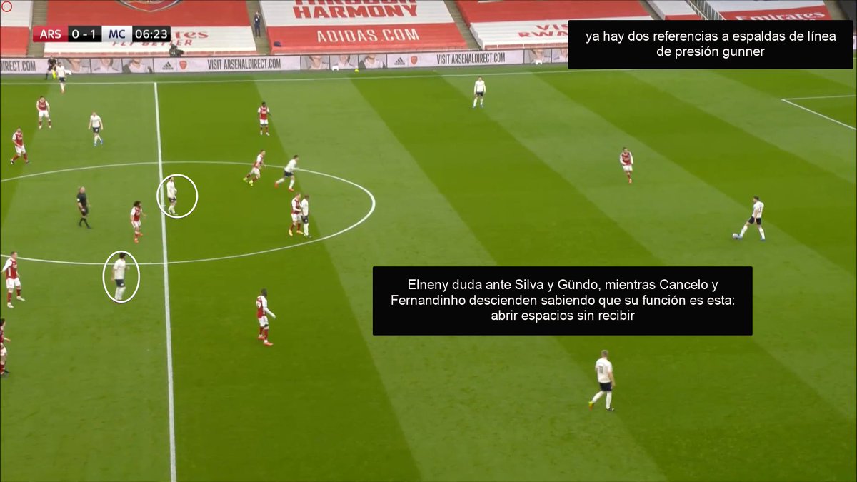 En un City que deja a la defensa rival sin referencias reales a las que poner su vista, deja estampas como esta. Elneny de central, Holding lejos de su zona persiguiendo a Bernardo. Nadie de 9. Amplitud, movimiento, intercambio posicional. Sinergias.