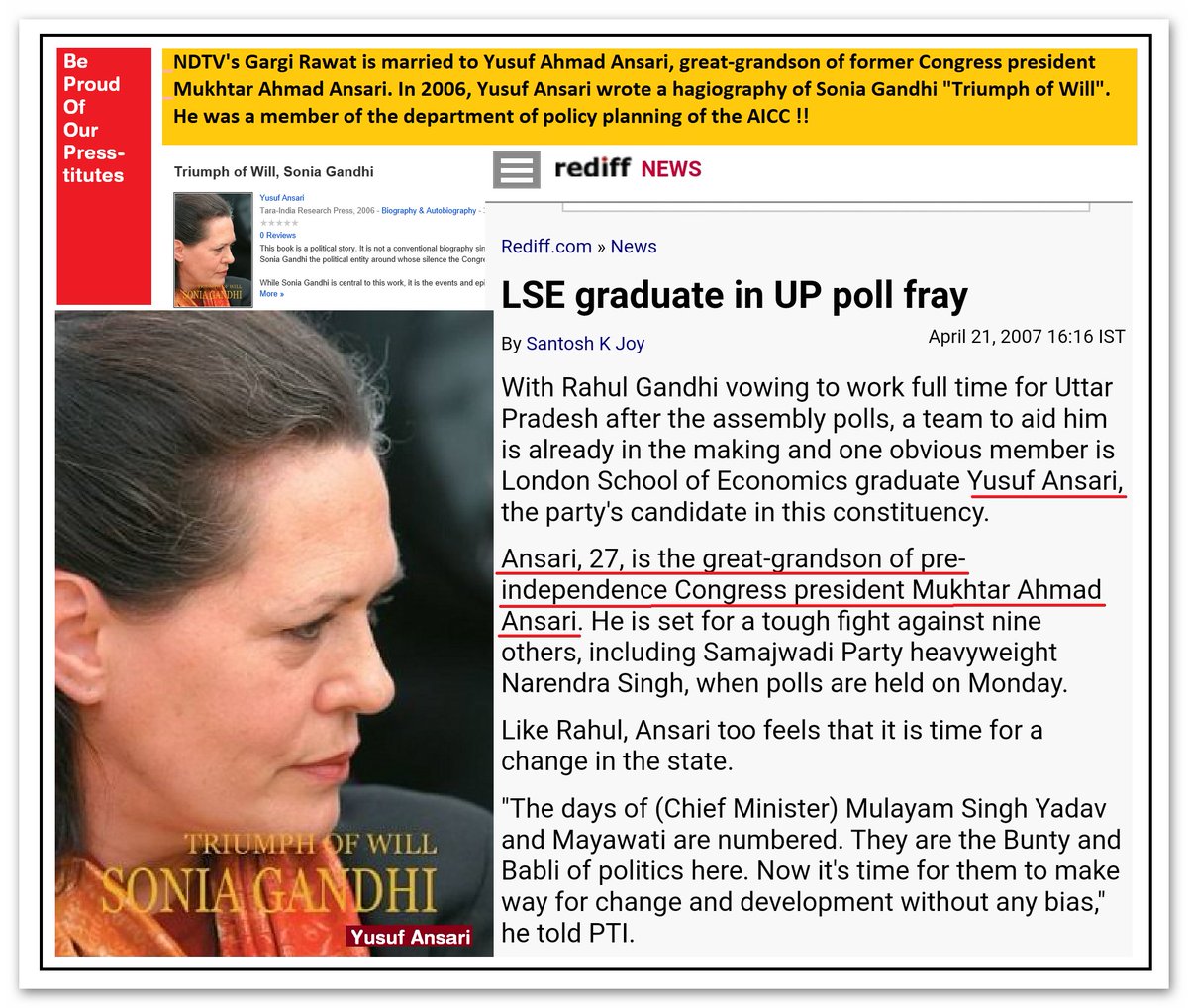 In 2006, Yusuf Ansari wrote a hagiography of Sonia Gandhi "Triumph of Will" !!