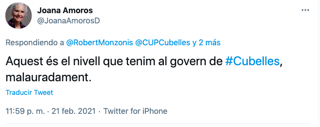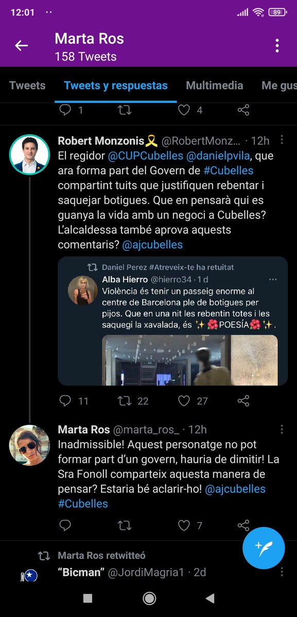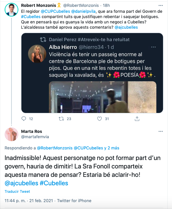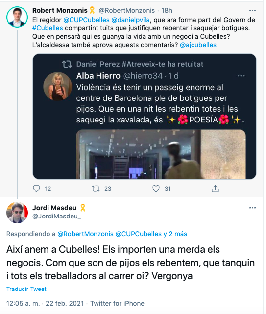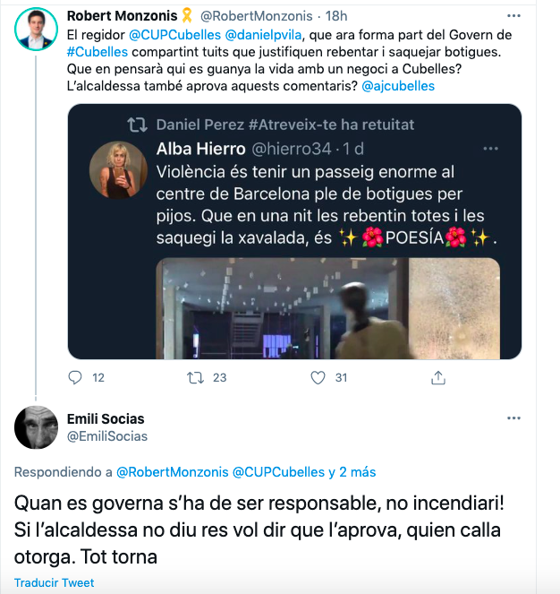 Ahir a la nit el portaveu municipal de Junts per Cubelles @RobertMonzonis va fer una piulada criticant que el portaveu de la @CUPCubelles, @danielpvila fes un retuit d'una piulada que justificava els atacs que han patit aquests dies els comerços de Passeig de Gràcia.