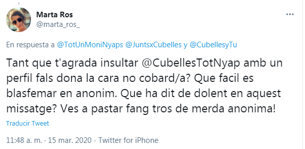 Des d'aquest perfil es donava suport i notorietat i, a més, es titllava a altres perfils de ser falsos i d'amagar-se darrera l'anonimat: