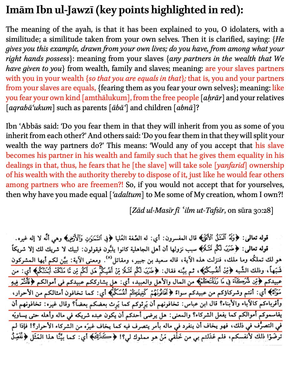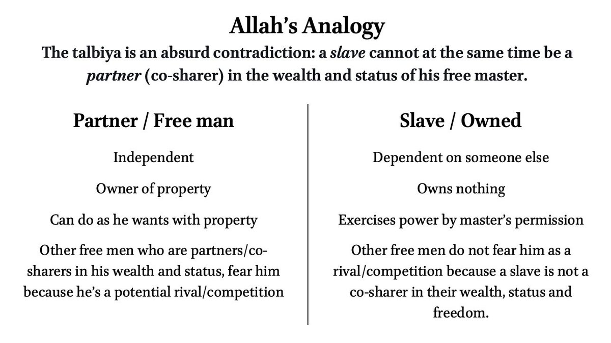 Allah's analogy exposes an absurd paradox in the talbฤซyah: you can't claim someone is a partner (equal in ownership/status/lordship) with the master and, ๐๐ก ๐กโ๐ ๐ ๐๐๐ ๐ก๐๐๐, say that the master still owns them.