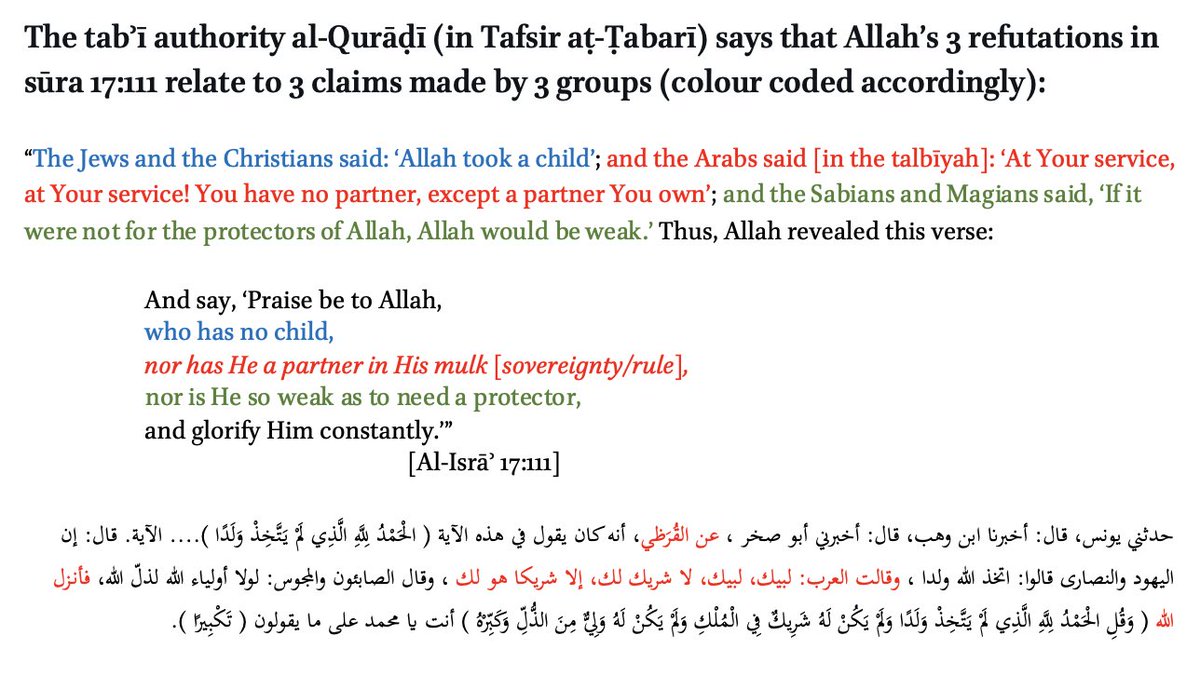 The shirk ur-rubลซbiyyah in the verse just discussed is consistent with sลซra 17:111, which the tabสพฤซ authority al-Qurฤแธฤซ says, was also revealed in response to the talbฤซyah:
