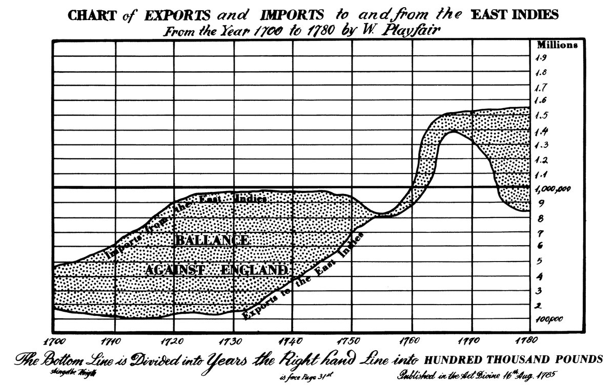 3. Beware the line-width illusion. You probably didn't notice the hump in the trade balance after 1760 in this graph (left) from William Playfair. We tend to assess the distance between curves at the closest point rather than the vertical distance.