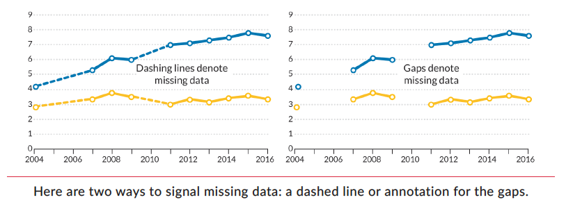 5. Use visual signals for missing data. I plucked this example from my book. Be sure to mark or note gaps where you have missing data. Never just ignore them and connect the line.
